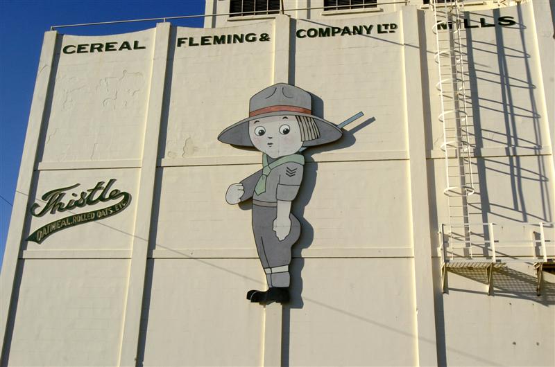 Across the railway tracks from the Romney statue stood the imposing bulk of the Flemings Mill, a mural of Sergeant Dan adorning the front wall. With his wide-brimmed slouch hat, shouldered rifle and shining boots, Sergeant Dan stood to attention, peering out over the town. Originally created in 1915 by Charlotte Lawlor, who worked for the advertising agency that handled the Flemings account, it seemed to me now, with the cynicism of age, that Sergeant Dan’s protruding belly, large buttocks and rouged cheeks were a little at odds with the rugged, tractor-driving, can-do, soldierly farm boy persona we attributed to him as kids.