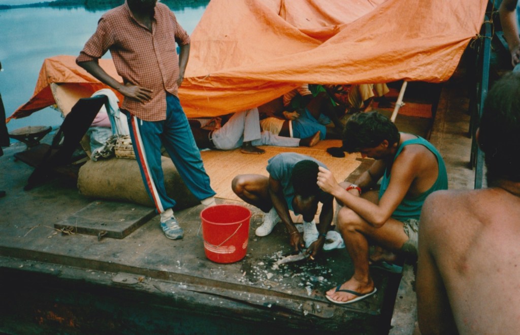 We continue downstream at first light. Slowly, people begin to stir aboard the barge. Women light their cooking fires and prepare the day’s first meal. The men collect in their usual groups around the deck to talk, smoke and play cards. Traders come out from the riverbank with their smoked fish and monkeys. The smoked monkeys are a macabre sight, their faces seared into grisly poses, teeth bared, eyes bulging.