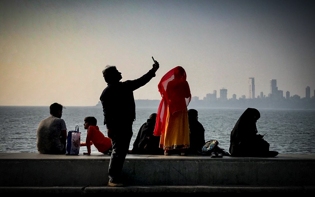 Midday in Mumbai. Outside the airport doors, it is a hot, blue day. A haze of dust hangs in the air. I can see palm trees and mynah birds, a flurry of taxis, a cohort of buses and a knot of people waiting at the kerb for their turn to depart the airport.
