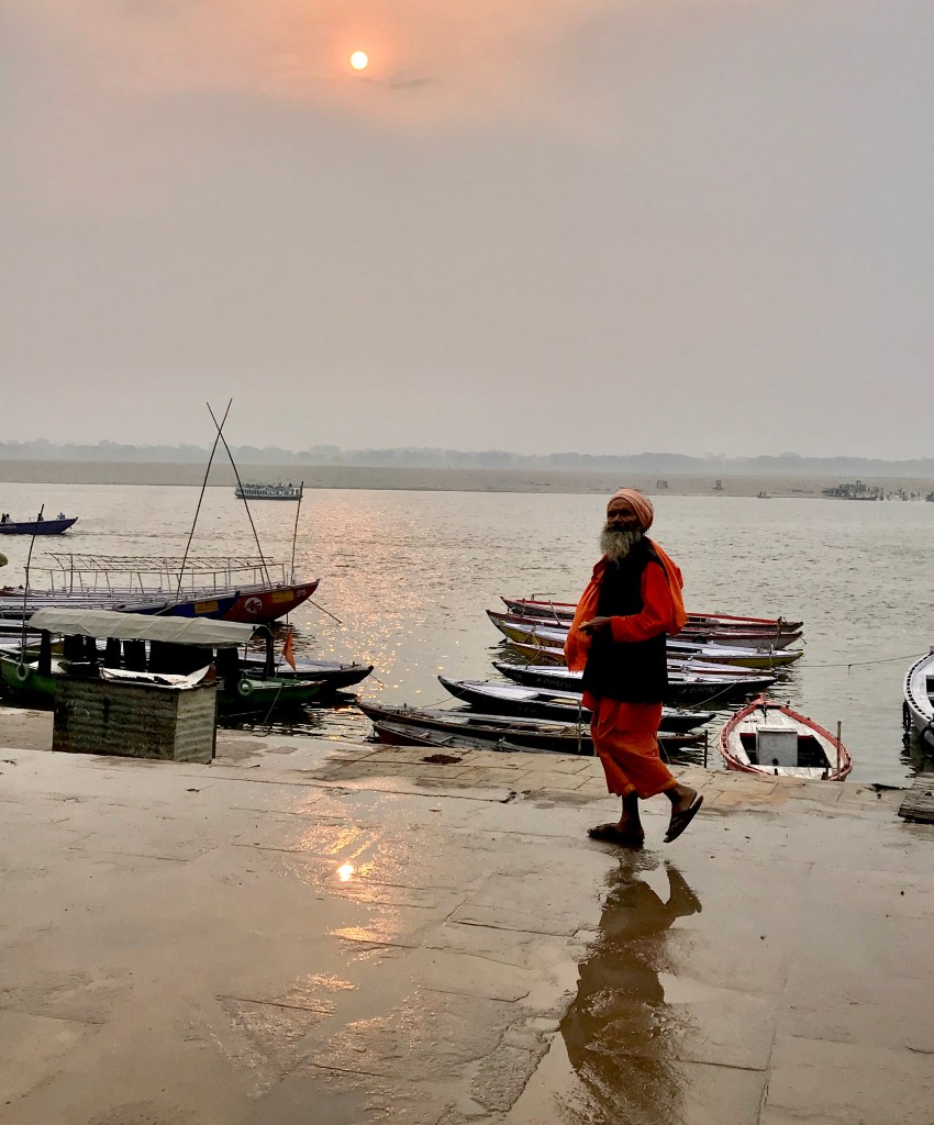 Varanasi lay under a pall of smokey haze. The ghats stepped back from the river in steep, crumbling, ancient layers, each layer built on the remains of others. Boats plied to and fro on the wind-chopped water. The sun rose scarlet across the river, casting a ladder of gold across the Ganges, then dissolved into the opaque sky.
