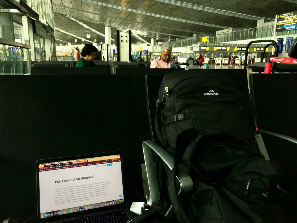 Mid-afternoon in Kolkata. Outside the airport doors, it is a hot, blue day. A haze of dust hangs in the air. I can still see the palm trees and mynah birds, the flurry of taxis, and the cohort of buses arriving at the kerb. The sun is at its zenith, casting hard shadows onto the ground. The tinted glass of the windows and doors gives an impression of coolness inside. But out here I am still shrouded by the hot breath of Asia. I have left the chaos and madness of downtown Kolkata behind. I have paid off my taxi driver: a thief who demanded twice the agreed fare once we’d arrived outside the Internationational Departures building. I have my backpack on and my passport in my hand. All I need to do now is to walk through the doors and out of Asia.