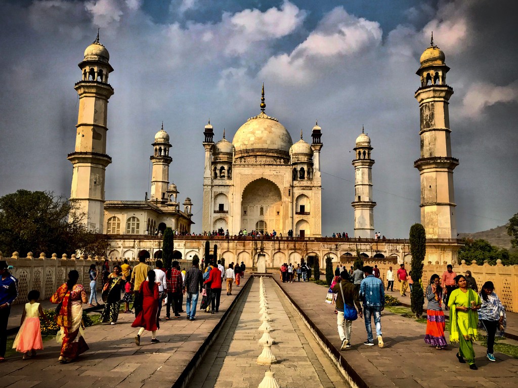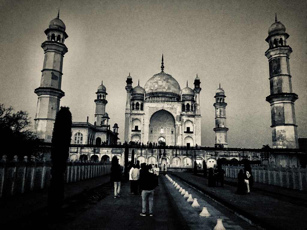 But in giving birth to their fifth child, Dilras Banu Begum died. Grief-stricken, Aurangzeb commissioned a monumental tomb for her. It would be the only great building that the Emperor would build during his reign. A pious, austere and parsimonious Muslem, Aurangzeb had little time for monuments. To him, the great works of his predecessors – Akbar’s Fatepur Sikri, Shah Jahan’s Taj Mahal – were of little use. To him, creating illuminated copies of the Qur’an were of much more significance in the temporal world. His late and beloved wife, however, deserved a monument that was of suitable grandeur: a monument to Aurangzeb’s conjugal fidelity. And so, Aurangzeb designed and built the Bibi Ka Maqbara.
