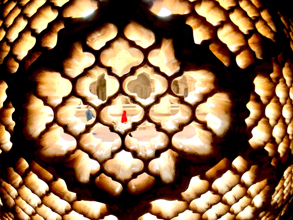 Crowds of afternoon visitors thronged the flagstones and side gardens. A long marble water-garden, dry now but still perfectly proportioned, drew me forward. I climbed a set of stone steps, removed my boots and entered the cool, dim inner sanctum. A cool breeze flowed through the interior from delicate lattices, carved from single slabs of pure white marble, set into four alcoves. Below the level of the floor, and covered by an intricate silken blanken, lay the tomb of Dilras Banu Begum: a perfect pearl intombed forever within her marble shroud.