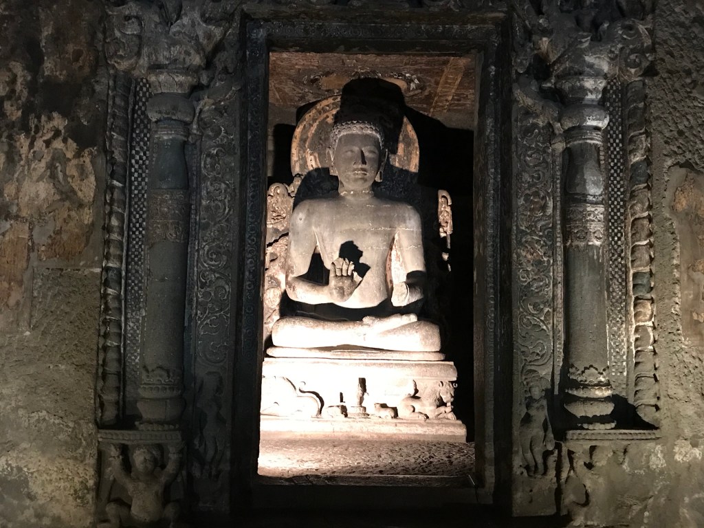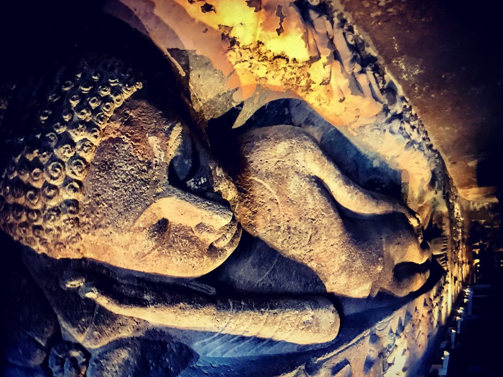 It was almost silent in the cavern. The air was cool, and fragrant with the aroma of polished teak. The only light filtered in through the narrow doorway, with its carved lintel and ornately-decorated flanking columns. I was barefoot. The floor of the cavern, polished smooth by the passage of countless other bare feet before mine, was cold and slightly damp. At the rear of the cavern, half hidden in darkness, a statue of the Buddha, composed and serene, sat in asana.