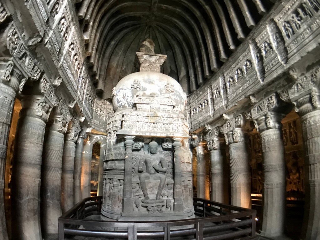 Beginning in the second century BCE (around 2,200 years ago), Buddhist monks began enlarging the caves at Ajanta. They carved elaborate decorations and effigies of the Buddha. They carved prayer halls and monasteries, temples and kitchens, cells for meditation and rooms for contemplation. When they ran out of natural caves to decorate, they began carving new ones. With endless patience, and the simplest of tools, they dug and scraped. The caves were works of art, affirmations in living stone to their deity, the Buddha.