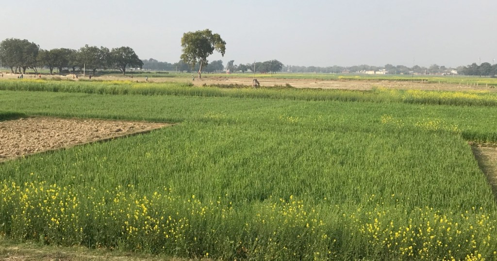 A wooden cart drawn by 2 white bullocks through a sea of green and yellow mustard.