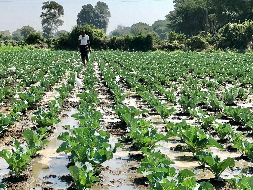 The gangly man was still working his way down the rows of cauliflowers, pushing the soil with his feet to allow the silver trickles of life-giving water to flow. Snow-white egrets followed the water, picking up worms and mollusks the water brought to the surface. I thought: “What a great job on a hot day, playing around in water and soil with cool mud between your toes and everything working in harmony.”