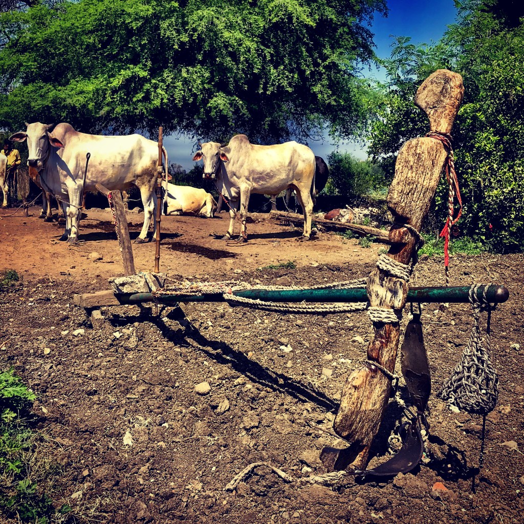 I squatted down with the farmer as he examined some of the cauliflower plants. They were healthy and pest free and were growing exceedingly well in the rich, red, crumbly soil. I left the farmer to his work and walked along the narrow path bordering the field towards a dwelling of some sort. However a barking dog rushed out of the compound towards me so I turned and walked back to the first building I’d seen and photographed a wooden plough standing upright in the soil beside the tethered bullocks.