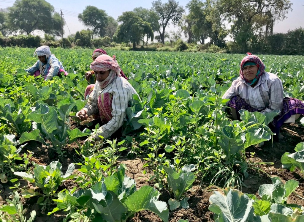 The farmer agreed to show me the crop and guided me along one of the rows to the group of women. They were chattering away as they worked, pulling out weed that looked to me like fathen (Chenopodium album), considered a weed in most crops but sometimes cultivated as a feed crop for chickens. The women seemed uninterested in me and carried on with their work.