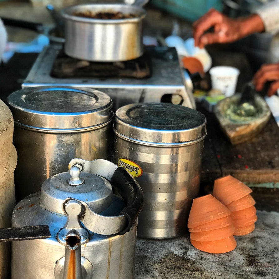 The chai wallah has milk boiling in an aluminium pan over a little diesel burner. He stirs in sugar and a handful of tea leaves. He is sitting cross-legged on the worn wooden step of his little stall. He takes a small piece of ginger and grinds it to a paste on a flat stone with a stone pestle. The ginger goes into the milk which is now frothing up as it boils. The chai wallah tidies his work area and arranges five little cups made from fired Ganges mud: the ultimate disposable containers.