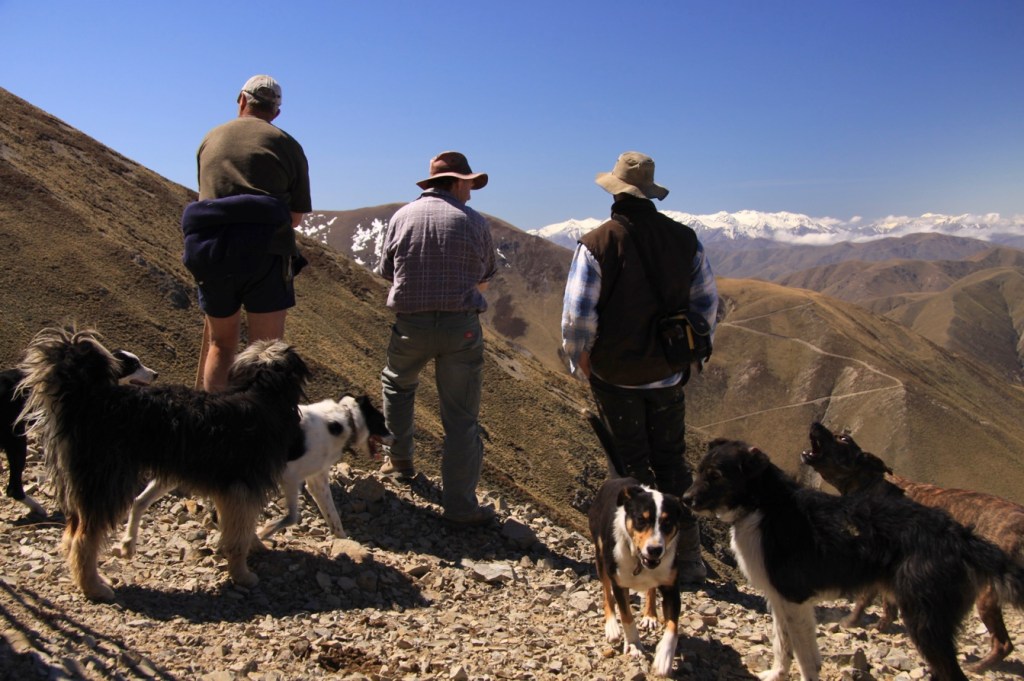 The musterers sit in the tussocks discussing the day’s work. Each has a story of good runs by their dogs and difficult sheep which had to be carefully extricated from a gully or ridge using cunning and skill. The runholder arrives in a 4WD with flasks of tea and a fruit cake. The dogs sprawl around in the sun, mark their territory with squirts of piss, occasionally snarling at errant youngsters.