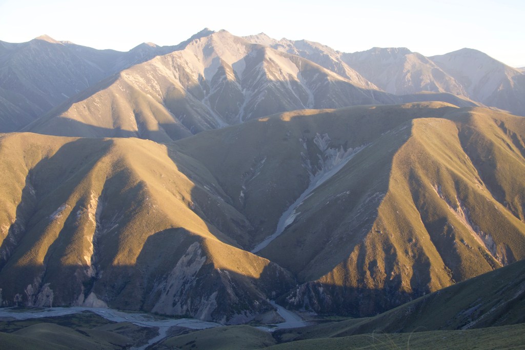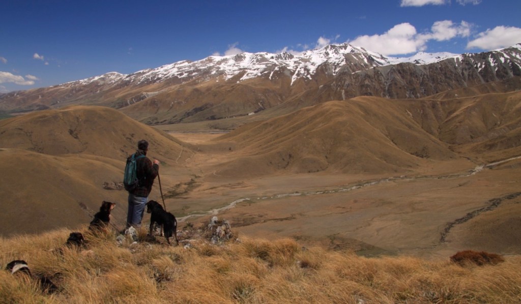 High above, on top of the High Claytons range, another musterer’s dogs answer the bark-up. From below, the dogs of the three other men, who are spaced at intervals down the hillside, complete the chorus. The noise echoes back back from the gullies and ravines on the opposite side of the valley, which lies in deep, hazy shadow. The river stretches a braided thread of silver along the valley floor.