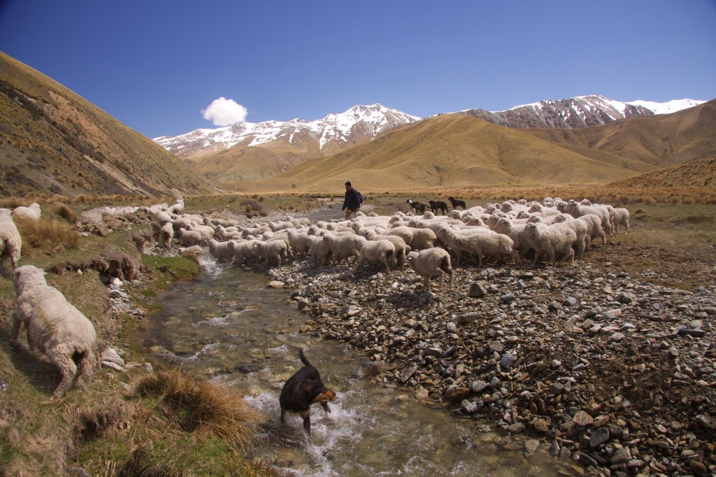 But the wethers, creatures of habit and suspicion, are reluctant to cross even this small creek bubbling across grey shingle between grassy banks smudged with matagouri. The dogs move the mob to the water’s edge. An older wether leaps across and soon the mob is following. The sheep string out across the hillside beyond.