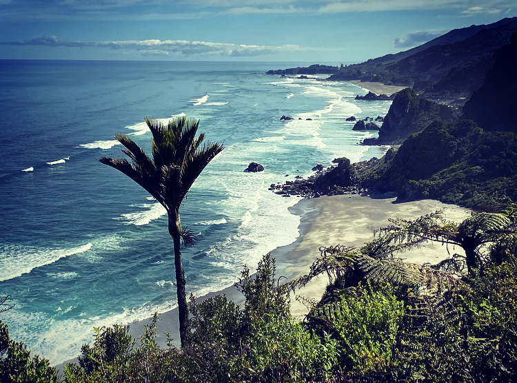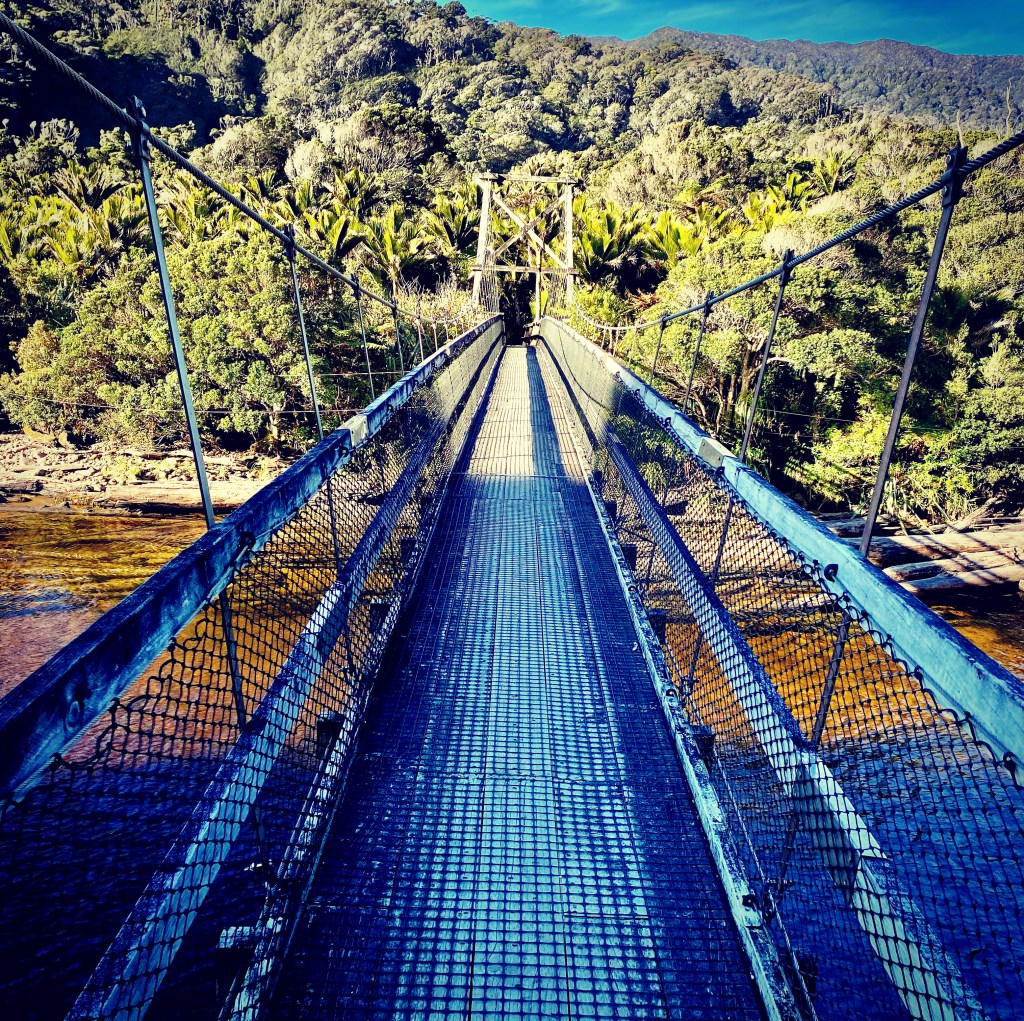 I followed the Heaphy Track upstream for half a kilometre to a bouncy swing bridge slung across the river into a forest of nikau palms. The nikau (Rhopalostylus sapida) is New Zealand’s only endemic palm tree and grows abundantly in the warm, sunny climate of northern Westland. The forest floor was composed of soft white sand and was carpeted with fallen fronds. The crowns of the palms formed a coruscated canopy overhead. Their trunks tapped and creaked in the gentle breeze blowing in from the ocean. I thought of Joseph Conrad’s evocative description of the Congo River in his 1899 novella Heart of Darkness: “ Going up that river was like travelling back to the earliest beginnings of the world, when vegetation rioted on the earth and the big trees were kings.”