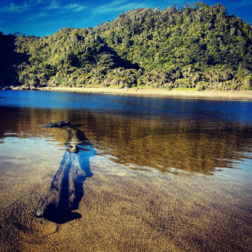 Jack’s Beach lay bathed in a dazzling shimmer of silver light. Beyond a screen of pure white dunes the Tasman Sea crashed onto the steeply-dipping shore. The Kohaihai River curled out from a forest of nikau palms and fell gently into the ocean beside a bluff of black rock encrusted with ferns and flax. The breaking waves pushed ripples of salt water upstream to combine with the tannin-dark fresh of the stream. My bare feet sank into the soft, yielding sand along the edge of the lagoon behind the dunes. The trunk of a massive rainforest tree, bereft of branches and shiny-black beneath the water, lay submerged in the shallows. A lone pied cormorant sat drying its outstretched feathers on a snag of twisted sticks and stones on the farther shore.