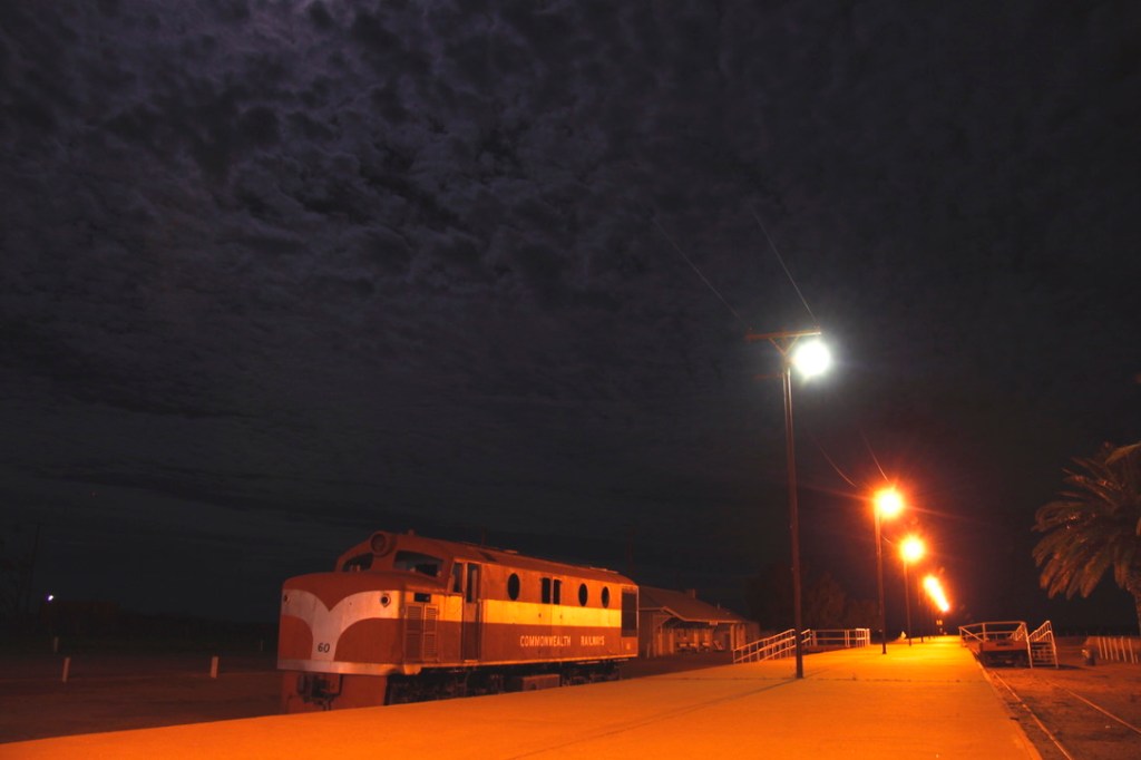 At Marree, the sky is on fire. Stretched across the western horizon, a bank of cloud glows molten red, shot through with stripes of yellow and mauve. The town’s only street gleams like a strip of burnished copper. Across in the abandoned railway yard, sway-backed buildings of timber and tin cast long shadows along the empty platform.