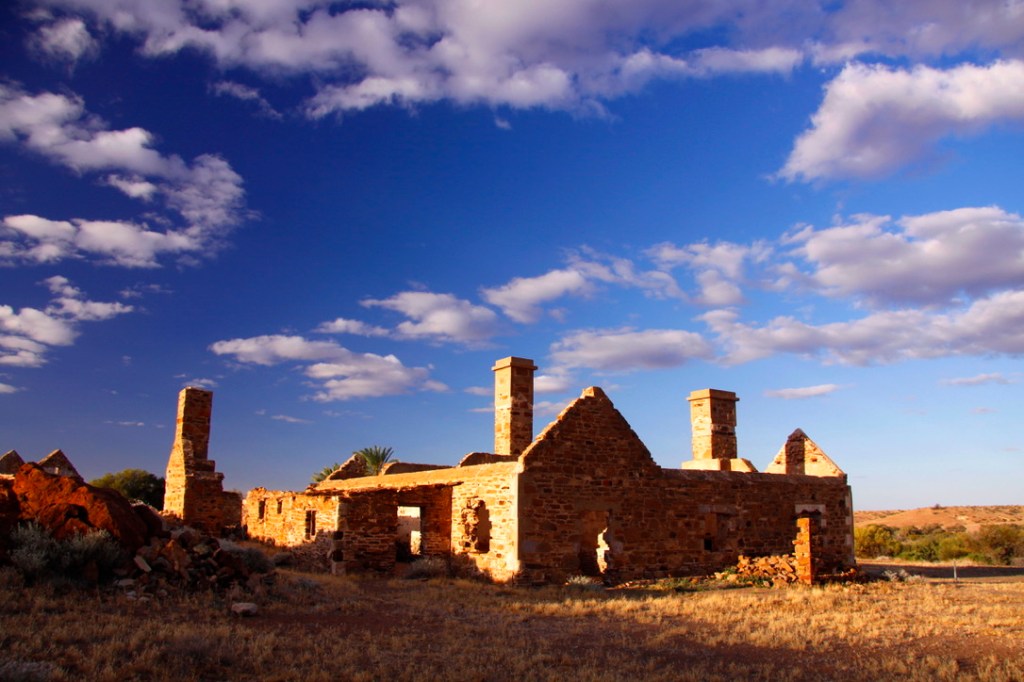 The ruins of the Old Peake Homestead overlook Freeling Springs, twenty kilometres off the Oodnadatta Track. The roofless stone buildings once housed a repeater station on the Overland Telegraph Line. Morse code signals coming to or from Adelaide were amplified here and then sent onwards. In its day, the OTL was cutting-edge technology; communications between Britain and Australia which had once taken months now only took a few hours. I hold up my smartphone and photograph it with a pair of telegraph poles behind. The telegraph line is long gone; cell phone coverage is a distant memory. No one knows I am out here. I am incommunicado.