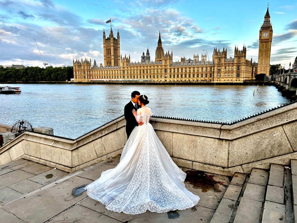A bride and groom are capturing their new beginning, on the steps leading down to the Albert Embankment. The Palace of Westminster stands grandly behind them on the far side of the river. The groom is stern-faced and rigid in a black suit; the bride, graceful and willowy in a cascade of pure white silk, wears a tiara of shimmering diamonds. I ask if I may take their photo. The groom smiles and nods; the photographer seems annoyed by my intrusion. I say “congratulations” and walk out onto the bridge.