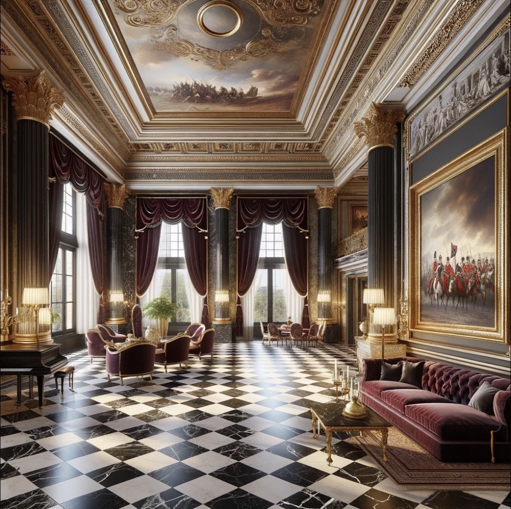 He leads me into a grand, open space with floor tiles in the black and white Nelson Checker, Doric columns, and several large leather sofas. I take a seat and stare, unbelieving, at my surroundings. Sunlight falls in an ivory wash across the tiles. A portrait of a member of the royal family (the regiment’s patron), resplendent in a blue gown and wearing a diamond tiara, looks warmly down at me.
