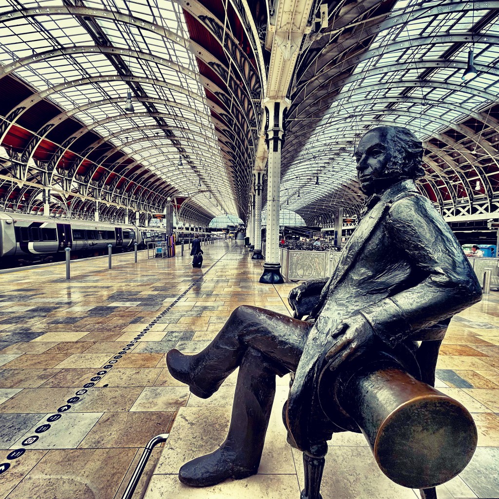 Amidst this orchestrated onomatopoeic chaos, a figure sits. He is as integral to Paddington Station as the tracks that crisscross beneath its grand canopy. It is Isambard Kingdom Brunel. This titan of engineering, rendered in bronze, surveys his creation from a seat alongside Platform 4. In top hat and coattails, his presence is as commanding as the structures he envisioned. His big whiskers frame a broad, friendly face, eyes twinkling with the satisfaction of a visionary beholding his legacy. This is Paddington Station. This is his hall. And he is the railway king.