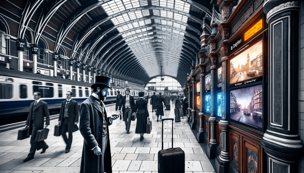 In my imagination, I can see two worlds: the Victorian and the digital rendered at once in black and white and shimmering colour. Digital screens displaying departure times and advertisements flash alongside the 19th-century ironwork and tiling. Amid the 21st-century hustle, echoes of the Victorian era subtly reveal themselves in the characters around me. The man in the smart suit, intently checking his iPhone, could be a Dickensian bookkeeper hurrying to his cellar-room counting house behind a wooden door with a rattle in its throat.