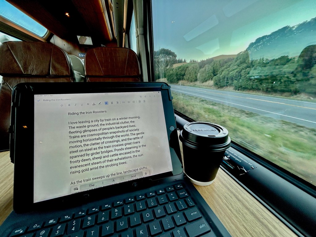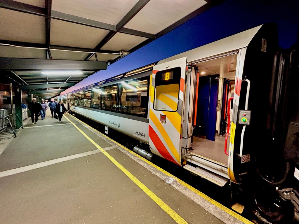 I collect my ticket from the counter — Seat 7B — and then await the boarding call. It comes over the tannoy at 06:50. I walk down the platform to the far end of the train and take a photo with my phone looking back up the platform with the train standing poised for departure. Inside the carriage, it is warm and quiet. The sun is lightening the eastern sky above the city skyline. At precisely 07:00 the train begins to move. It glides effortlessly out of the station, around a sweeping left-hand bend, across Riccarton Road, and north through Merivale and Papanui along its silver lines.