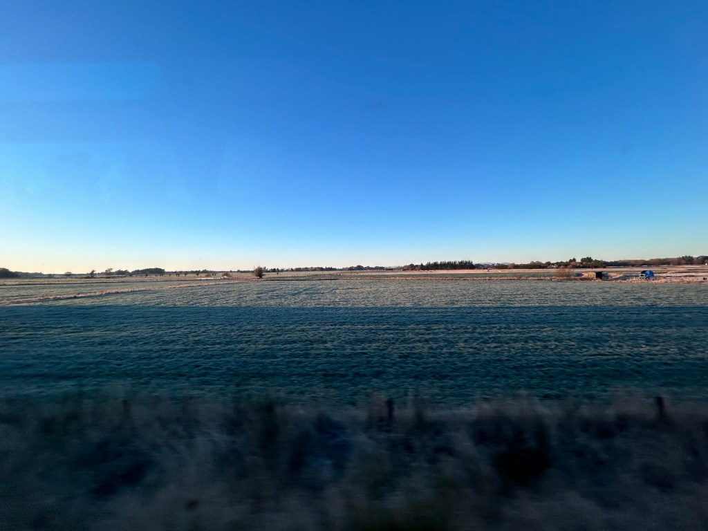 Inside the cafe carriage, the scent of coffee mingles with the murmur of hushed conversations. The café attendant is having a break, eating toast, and scrolling her phone. Her long fingernails tap tap tap on the screen. Outside, in tiny towns and rural localities, people are beginning their day. The ventilation system brings in the occasional waft of woodsmoke and fallen leaves. The sun, still low on the horizon, casts long shadows across the folds of the hills and the wrinkles of the river valleys. It shines on the bow-string fences and glitters on the frost of shady hollows.