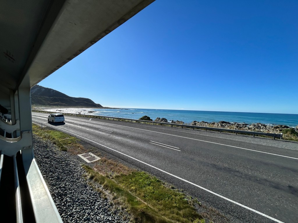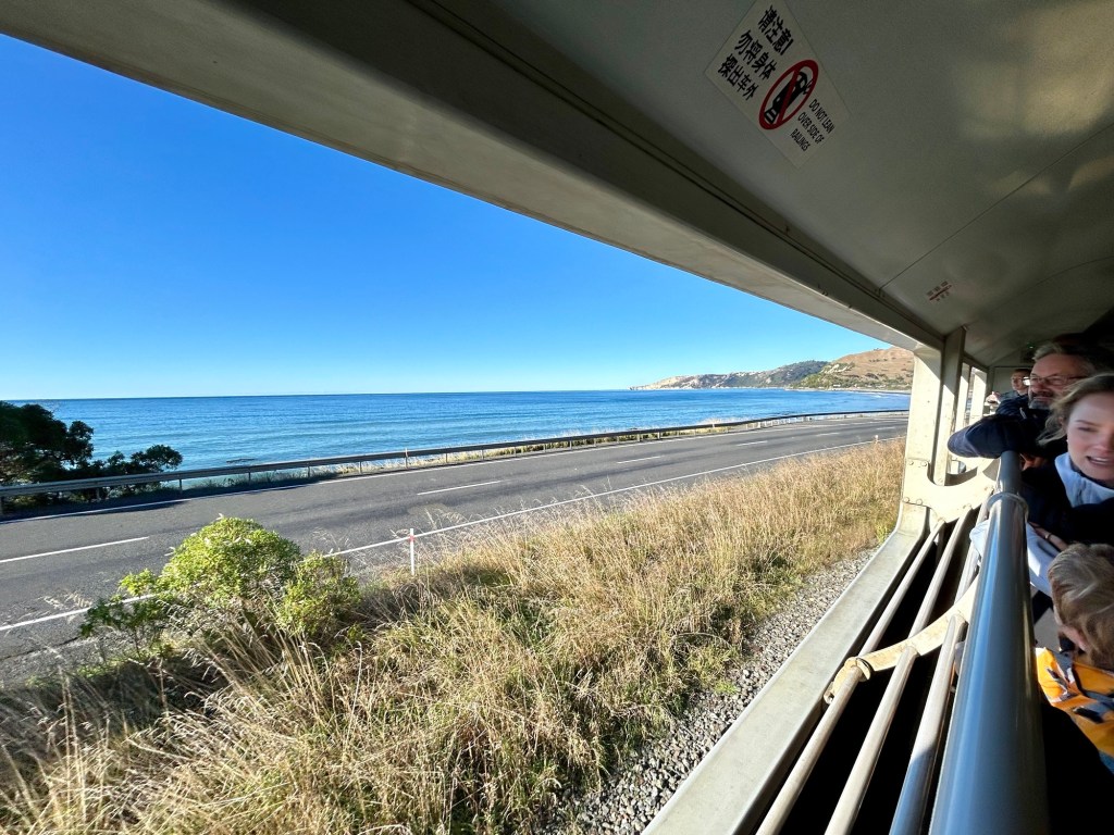 The line passes through a series of tunnels. The highway is right beside the line and truckers wave at the passengers standing in the open observation deck. The ocean shimmers in the sunlight. Offshore, hidden beneath thousands of metres of water, the Hikurangi Trench funnels cold, nutrient-rich currents up to the surface. New Zealand fur seals, several species of whales, dolphins, and a plethora of pelagic birds thrive in these waters which have been described as “an underwater Serengeti.” Whale-watching aircraft turn in the sky overhead; a flotilla of cray fishing boats patrol their fishing grounds.