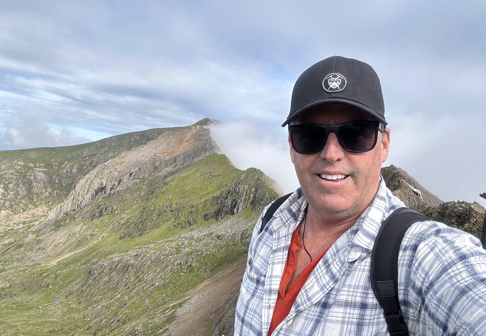 But as a former high country shepherd, clambering over bluff country holds no fear for me. Indeed, up here on this high, exposed ridge, I feel exhilarated and confident. I have my 360 camera recording atop a pole protruding from my backpack; I have my iPhone in my hand. The views are astounding: a heady combination of rock, air and sky. The mist lies like a pool against the inside edge of Crib Goch; on its outer edge, the views stretch away into a blue infinity of rolling hills and the distant, glittering ocean.