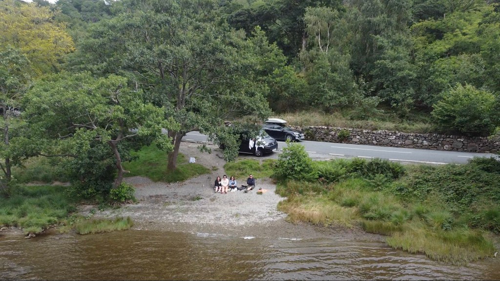 We leave the vale of the Conwy and drive over a low pass slung beneath the eastern flank of Snowden. The road is narrow and crowded, with steep drops to rushy meadows on the outside of the drystone barrier wall. The road wiggles and winds down into a U-shaped valley, its glacier-carved sides scored with benches gouged by the inexorable ice of the LGM. At the bottom of the valley, Llyn Gwynant lies in a frame of dark green conifer forest. We park at a small layby and sit on a tiny skirt of shingle beach eating a picnic lunch. Charlie does a two-kilometre swim in the dark water; I fly my drone.