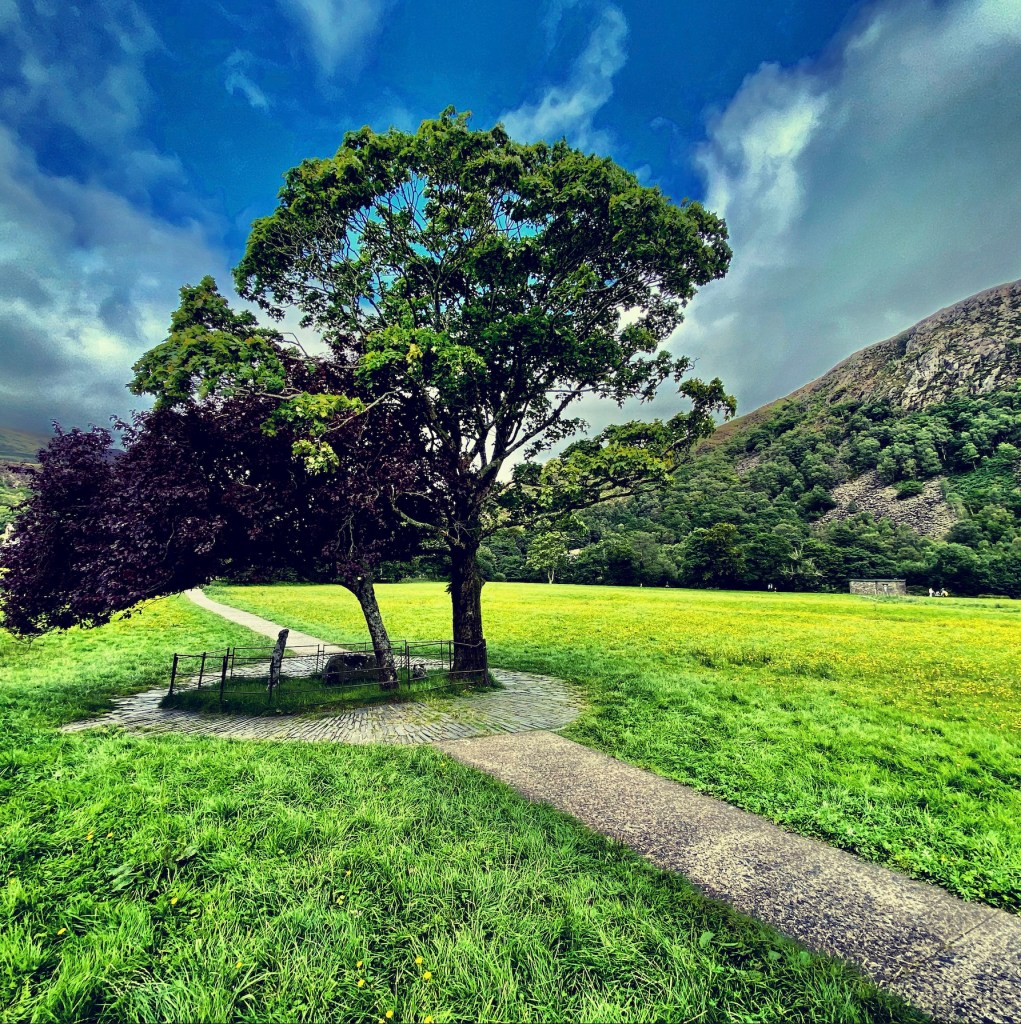 The grave of Gellert lies in a grassy meadow that runs down to the tree-lined bank of the Afon Glaslyn. Buttercups and daisies sway in the gentle breezes that waft down from Moel Hebog; a few elms at oaks are dotted about the field. As we walk up through the meadow we pass walkers with dogs, a few hikers fresh from the nearby peaks, and an assortment of kids playing about in the sun. A few sheep graze the grassy sward. The grave itself is a simple stone plinth, sheltered by a copper beech and an alder. Nearby, in the tumbled-down remains of a stone crofter’s hut, a bronze statue of Gellert peers out at the hills.