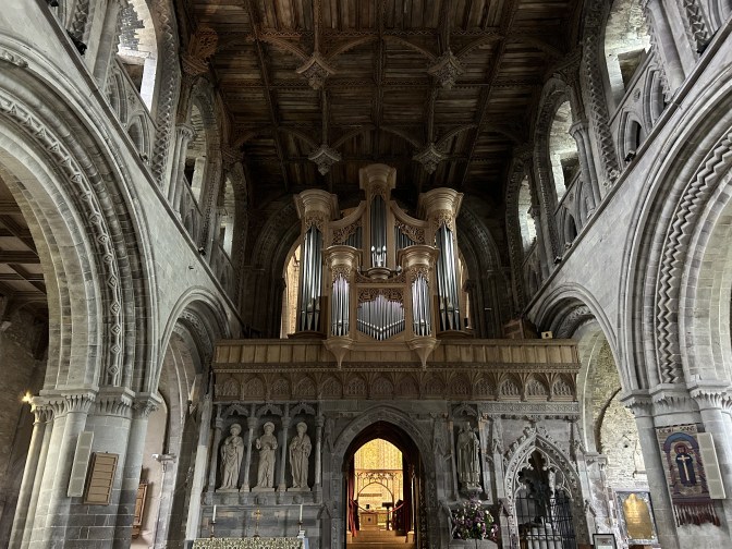 I enter the cathedral via the west narthex. The heavy door, hung by massive hinges of wrought iron, creaks slightly as I open it. I feel a slight exhalation of warm air from within, as if the cathedral is breathing. I step into the vestibule and the silence. Immediately, my eyes are drawn upwards by the great stone pillars to the ornate timber ceiling. Decorated with geometric inlays, the square wooden panels of Welsh oak are picked out in shades of blue, red and buttery yellow. Completed in the 1530’s, the ceiling is unique in Britain: a masterpiece of its age. Huge pendants of carved wood, like the knees and spirketting of an inverted, age-of-sail ship’s hull, hang from the ceiling: architecturally and spiritually unnecessary but adding an impression of sturdiness, longevity, grandeur and immutability.