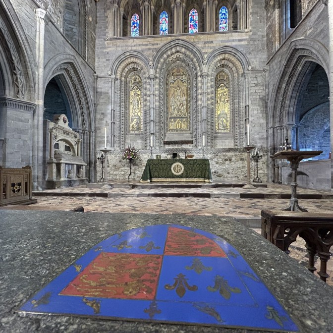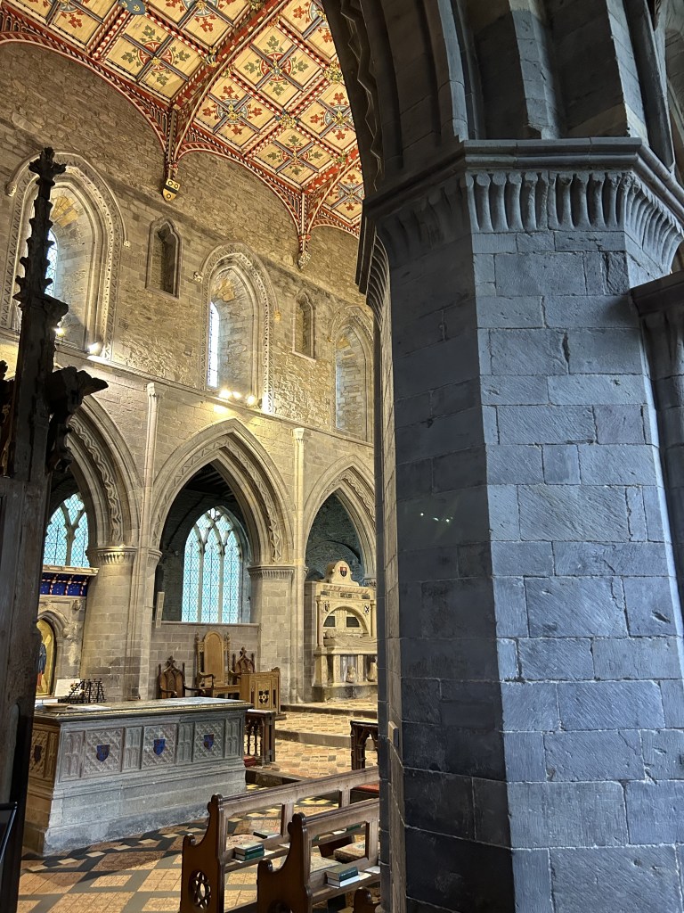 Beyond the quire, the High Altar draws me towards the spiritual heart of the cathedral. The tombs of Lord Rhys ap Gruffydd, Edmund Tudor and St. David himself flank the altar. An ensemble of pointed arches and Gothic ribbed vaults soar heavenward: an effect that the architects envisaged would draw the eyes upwards in reverence and awe. The altar itself stands beneath three opulent reredos. These decorative screens, crafted to resemble windows, are inset deeply into the rear wall of the High Altar space. They give the impression of looking through portals, each one framing a sacred narrative, as if the viewer is gazing into a spiritual dimension beyond the physical dimensions of the cathedral. The window-like design of the reredos enhances the depth and perspective of this sanctified space. They also symbolically open up the wall, inviting the viewer to contemplate the divine stories of Christian lore that they depict.
