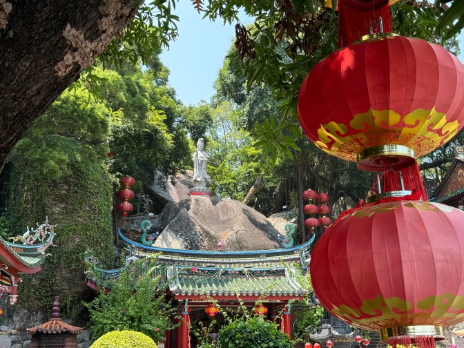 I sit for half an hour beside the temple entrance beneath the beneficent gaze of the three golden Buddhas within, drinking water from a tap set into a mossy grotto and letting my jangling nerves and knotted muscles relax and defray. The calming sound of the mantra, the scent of the joss sticks and the quiet devotions of the people coming to pray at the altar seem to revive and re-energise me. Eventually, feeling more in control of my situation, I set off up the narrow stone stairways that lead upwards to the open-sky Nirvana of Sunlight Rock.