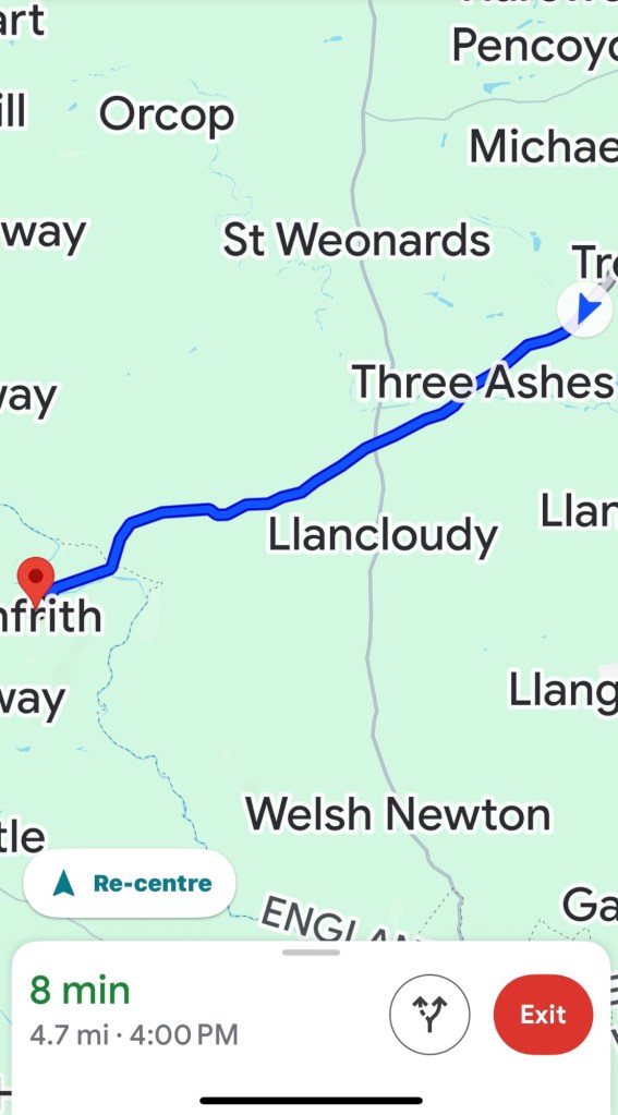 West of Ross-on-Wye, we turn off the A4137 onto the B4521. Tui is asleep on the back seat. I have figured out the car’s controls—the indicator is on the opposite side of the steering column to what I’m used to—and have my Spotify playing via Bluetooth through the stereo: Jethro Tull, Songs From the Wood. Appropriate.