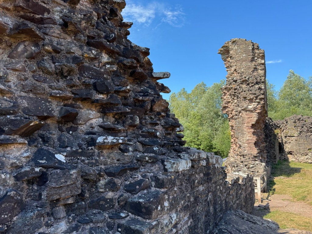 Skenfrith Castle. It rises blunt and squat from the turf, its round tower split open like an overripe fruit, exposing the dark interior to the bright Welsh sun. The curtain walls have sagged and crumbled under the weight of centuries, their mortar crumbling like memories into the grass. But the bones are still here, enough to see the outline of a once-formidable stronghold. This was not a place of ceremony or leisure. It was a place of warning, of watchers, of weaponry and walls.