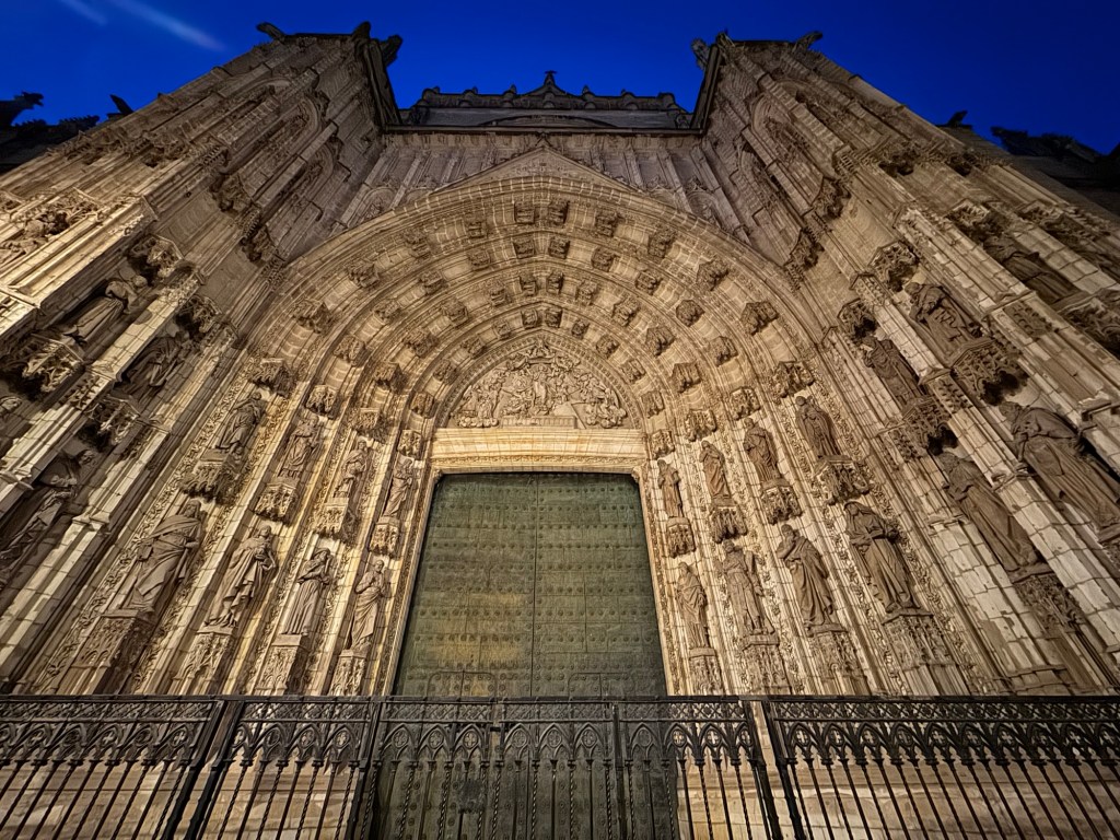 The Cathedral broods above the great square as the dawn slowly turns the sky from indigo velvet to pale porcelain blue, soft as fabric. The stars have faded, but the lamps still burn brightly beneath the watchful gaze of La Giralda. Even the fountain—usually chattering with the sound of falling water—stands mute at this hour, its carved faces expressionless in the half-light.