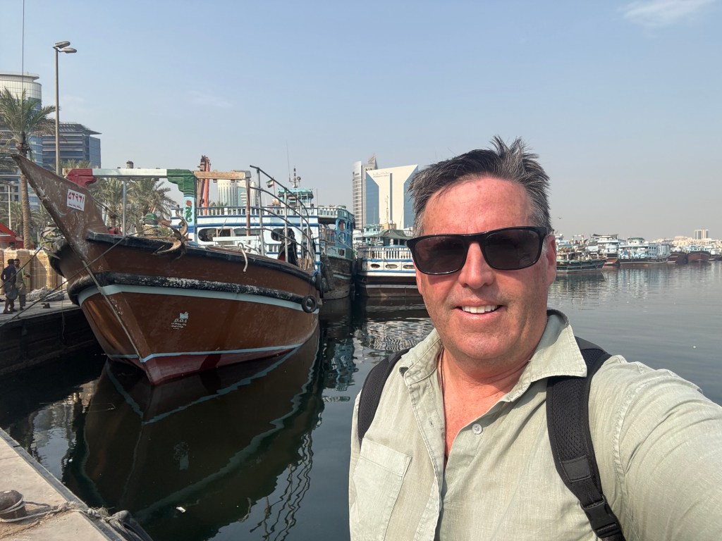 Across the still water, the dhows sit shoulder to shoulder, tethered and patient, their painted hulls faded by sun and time. They’re not museum pieces: these are working boats, loading and unloading goods in a quiet rhythm that’s been going on for centuries. And in this moment, I could be anywhere on the Arabian Sea or the Indian Ocean. Oman. Gujarat. Balochistan. Africa’s Swahili Coast. This corner of Dubai is not the city of glass and towers and tourists. This is the city’s memory.