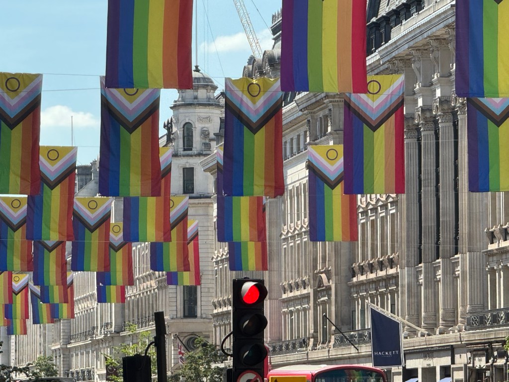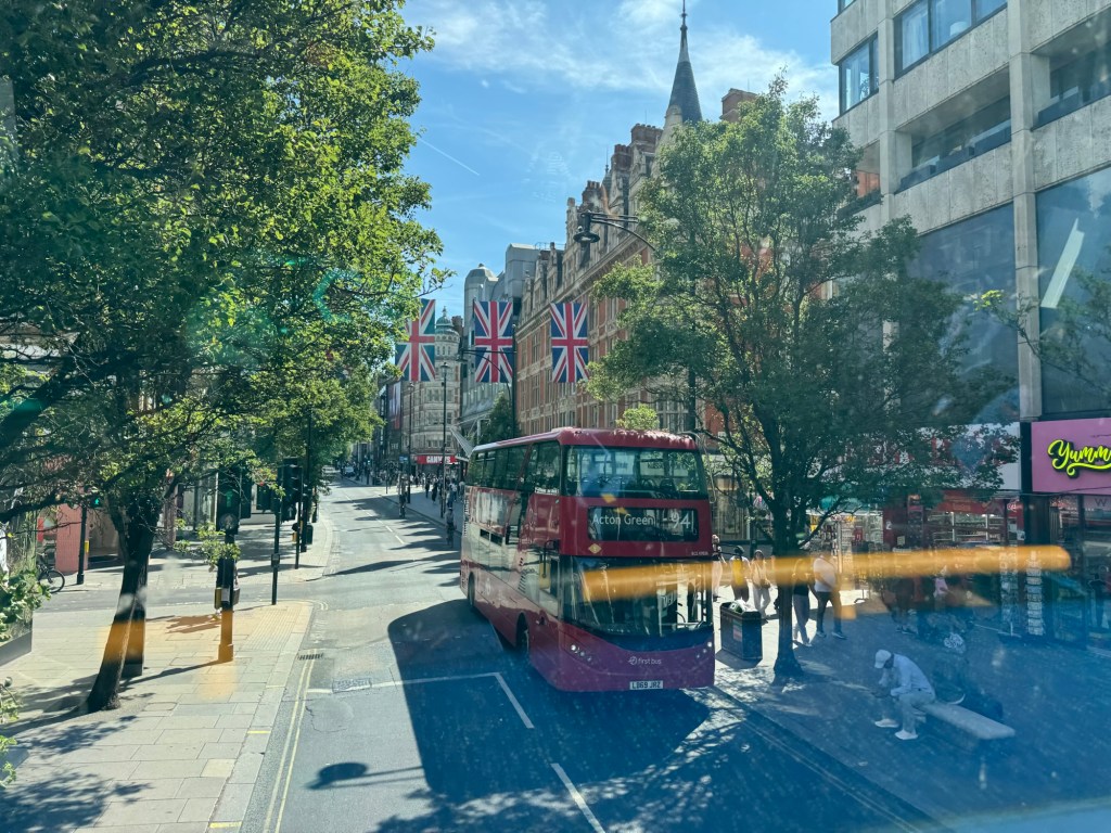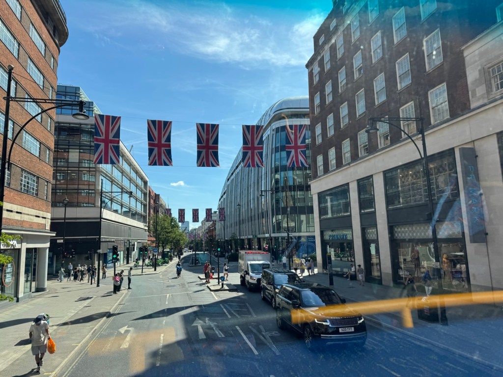 Union Jacks strung overhead flicker in the breeze: neat rows of red, white and blue fluttering against the sky’s hard blue dome. Beneath them, the shops of the empire of Neon Brittania: Primark, Zara, Foot Locker, JD Sports, glowing like secular cathedrals. Through the windscreen, the curve of the street stretches out like a canyon carved by commerce. Black cabs cruise past like urban gondolas. Somewhere behind me, a child squeals with delight at the sight of a red bus passing us in the opposite direction: the quintessential London encounter, mirroring itself.