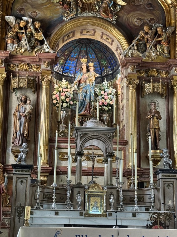 Before me rises the gold and shadow of the retablo. Angels with upturned faces cluster at its summit, their robes frozen in eternal flutter. Mary, radiant beneath a blue-domed canopy of glass, gazes down from the centre, flanked by saints in solemn pose. Everything glows. Candles flicker in the silence, their flames barely daring to move. Gold leaf catches the dim light like fire trapped in wood.
