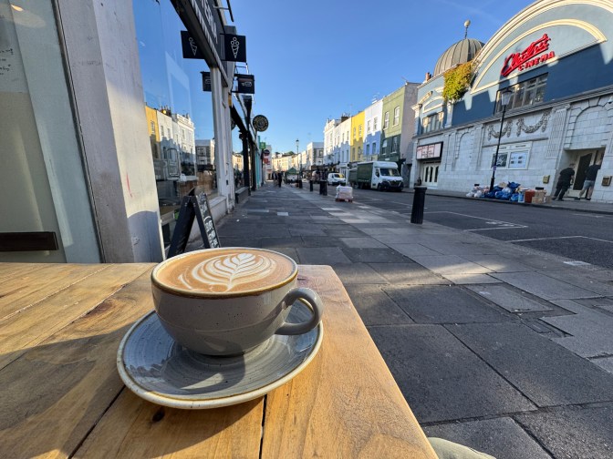 The fruit vendors are calling their prices. A man in a Panama hat rides past on a bicycle with a small dog in the front basket. Somewhere, out of sight but not out of earshot, someone is busking with a guitar and a voice like sandpaper. There are Union Jacks and second-hand books and antique cameras on trestle tables. And everywhere, there’s the sense that this is its own place: not just a neighbourhood of London, but a village that happens to have been swallowed up by the city. Notting Hill doesn’t feel like part of the capital. It feels like a walled garden. A stage set. A place apart.