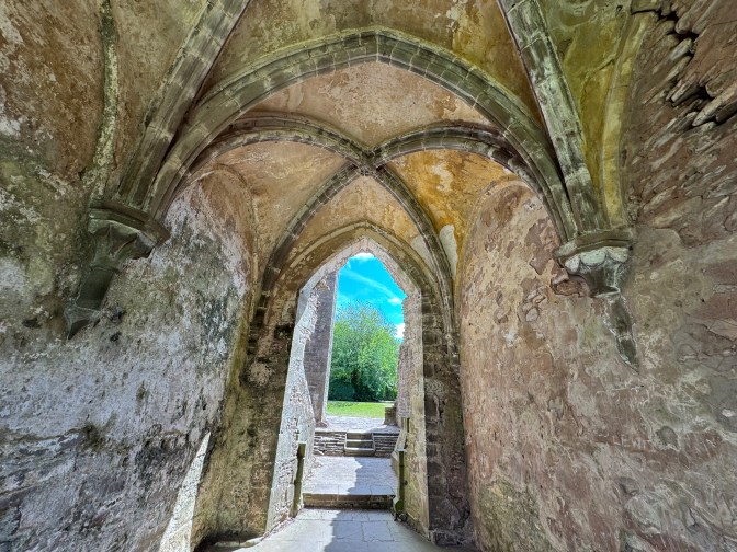 Outside again, I pass through the shadowed corridor where the pointed vaults still hold. The roof above is cracked and weathered, the stonework laced with centuries of lichen and moss. But through the arched opening ahead, the light pours in: a flood of summer brilliance at the threshold. I pause in that half-light, watching the way the priory frames the world beyond it. The ruin doesn’t just sit in the landscape. It speaks to it. The shape of each window and column is echoed in the long curves of the hills behind. The ruin is not ruined. It endures in reflection, in light, in memory.