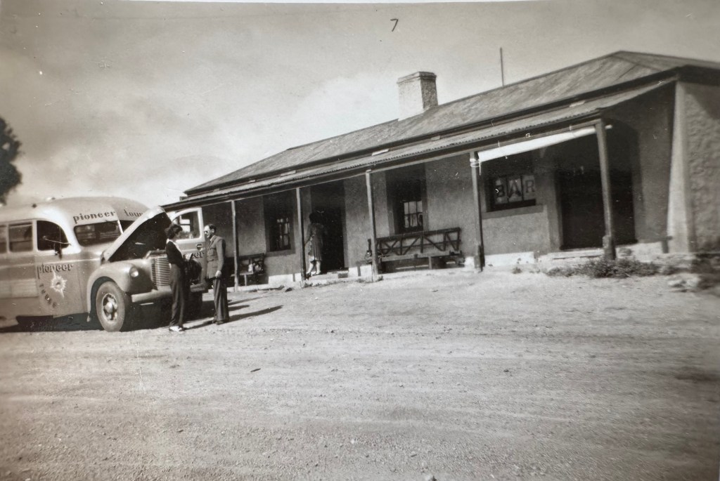 In the street before it, a bus is pulled up at an angle, its bonnet open; Pioneer Tours emblazoned on the side and above the windscreen. It’s the sort of service that tied the distant towns of the South Australian Outback to the passenger liners in Port Augusta.