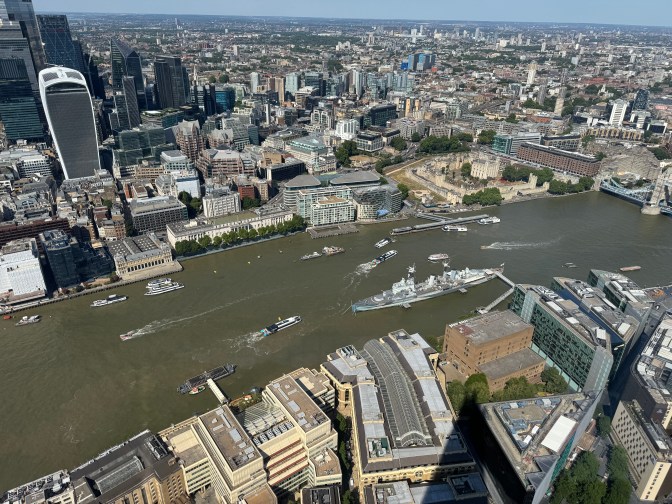 Northwards, the City’s skyscrapers thrust upwards like a steel mountain range. The Walkie Talkie bulges over the river; the Gherkin gleams in the sun. Below, HMS Belfast lies at permanent anchor, her grey flanks casting shadows into the brown churn of the Thames. Riverboats carve white grooves on the water in every direction: a choreography of wakes and currents.