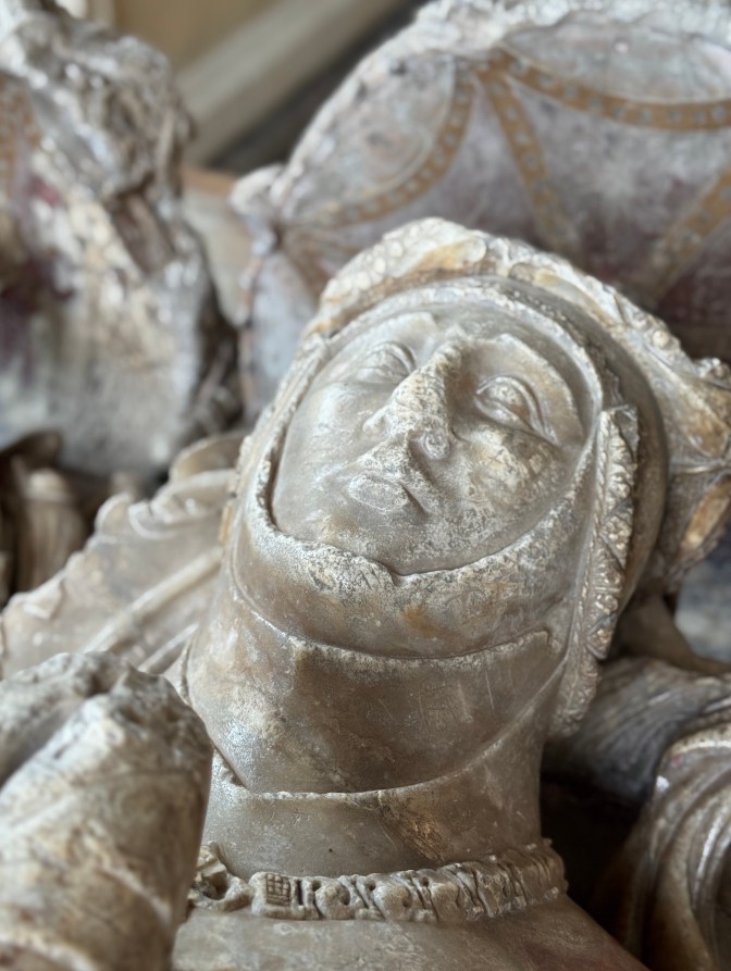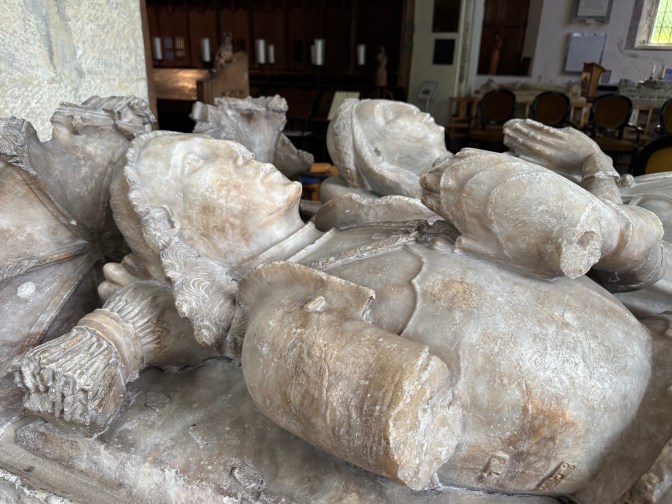 But his sword is broken. The blade and hilt gone, torn from his grasp by Cromwell’s iconoclasts when they ransacked the church, leaving only the ghost of its presence at his side. Whatever victories he claimed, whatever enemies he cut down, the weapon is dust now, and the man reduced to a little figure lying prone in the half-light. His hands are clasped in supplication, or in terror, and the angels above him keep singing. Whether they are welcoming him or warning him is left to the imagination.