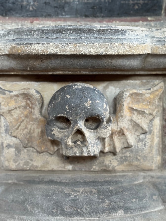 Beneath this formal piety, however, runs a darker current. At the centre of the tomb’s base is a winged skull: the “death’s head” of seventeenth-century funerary art. Its hollow sockets and grinning teeth are flanked by wings that look more like those of a bat than an angel. It is a reminder that even the most virtuous life ends in the same flight into the unknown. Lower still, on the plinth, a skull and crossbones are carved deep into the stone, their weathered edges softened by centuries but still unmistakable in their meaning. Memento mori… remember you must die.