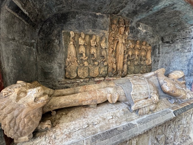 Another knight lies in a narrow alcove, his armour still wrapped about him as if he might rise at any moment. A lion curls at his feet. It’s mane spills into stylised locks; its jaws are parted as if it is still ready to roar on his behalf. Behind him, the wall is alive with figures: flights of angels caught in mid-song, their stone robes hanging in stiff folds, their hands lifting instruments to lips that have never drawn breath.
